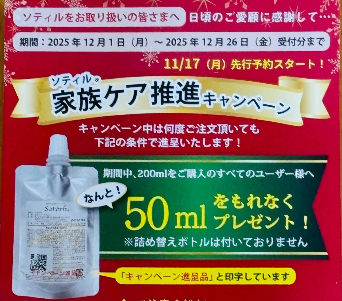 当店では「ソティル200ミリ」1セットをご購入いただいた方に、「50ミリ(4,180円)」1セットをプレゼントいたします。